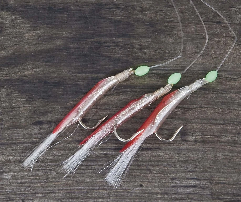 Vorfach für Großmakrelen-Dorsch, mit 3 Haken, Glimmer und Gummikörper ideal zum Meeresangeln auf Dorsch und große Makrelen