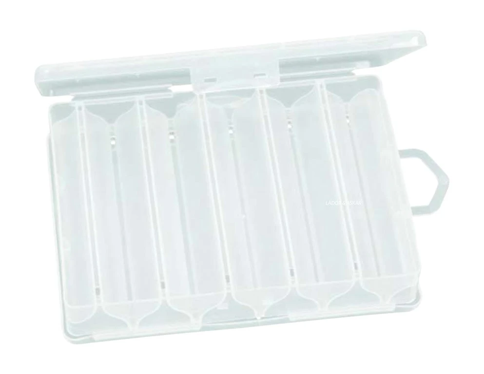 Die Box ist ideal für die Aufbewahrung von Kunstködern, wie Blinker oder kleinere Pilker. Sie ist von beiden Seiten befüllbar und besitzt auf jeder Seite fünf Y-förmige Einteilungen zur Aufbahrung der Köder. Durch diese Aufteilung finden viele Kunstköder auf kleinsten Raum platz. Die Größe der Box beträgt 19 x 9,5 x 3,4cm.