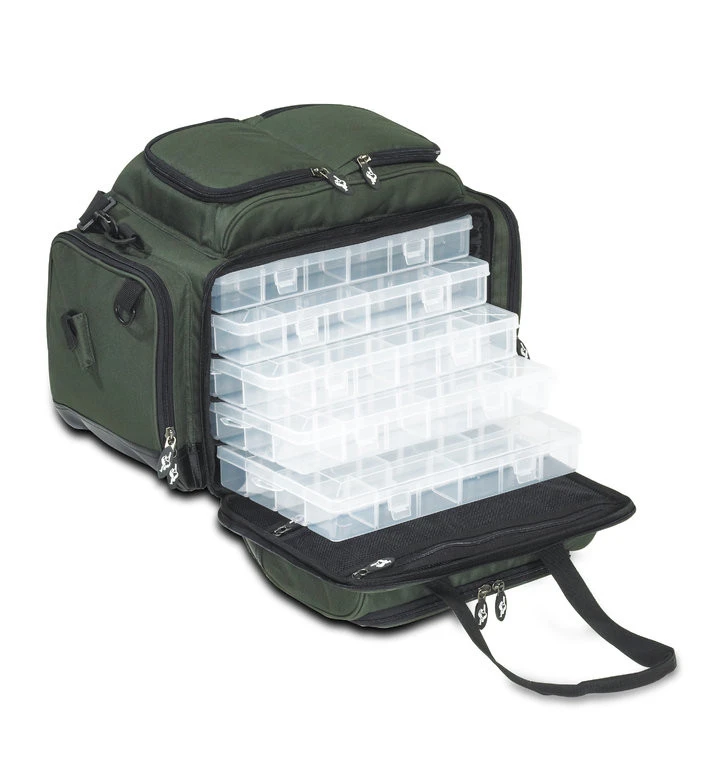 Eine große Tasche, wie sie sich vor allem Bootsangler schon lange gewünscht haben. Speziell Vertikal- und Drop-Shot-Angler finden hier eine Tasche mit 5 großen, individuell einteilbaren Tackleboxen, in denen etliche Gummiköder verstaut werden können. Die Tasche ist extra versteift und für jede Box einzeln unterteilt und fällt dadurch bei der Entnahme der einzelnen Boxen nicht so schnell wieder zusammen. Dadurch hat man schnellen Zugriff auf seine Köder und diese auch schnell wieder in der Tasche untergebracht.