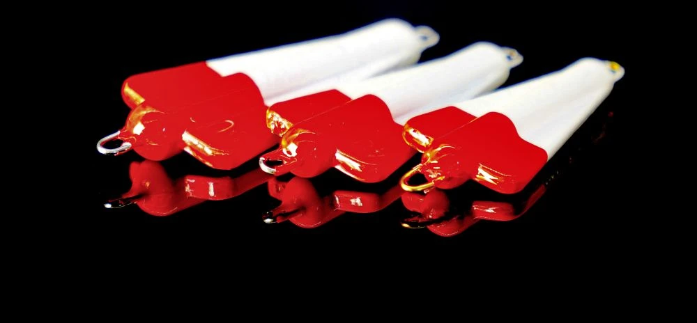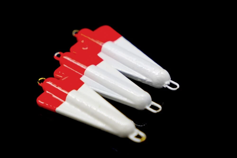 Diese Heringsbleie gibt es in unterschiedlichen Größen von 20g bis 60g. Sie sind rot-weiß lackiert und bleifrei. Sind sind somit umweltfreundlicher. Sie haben zwei Ösen und können somit je nach Zweck als langsam sinkend oder schnell sinkend montiert werden.
